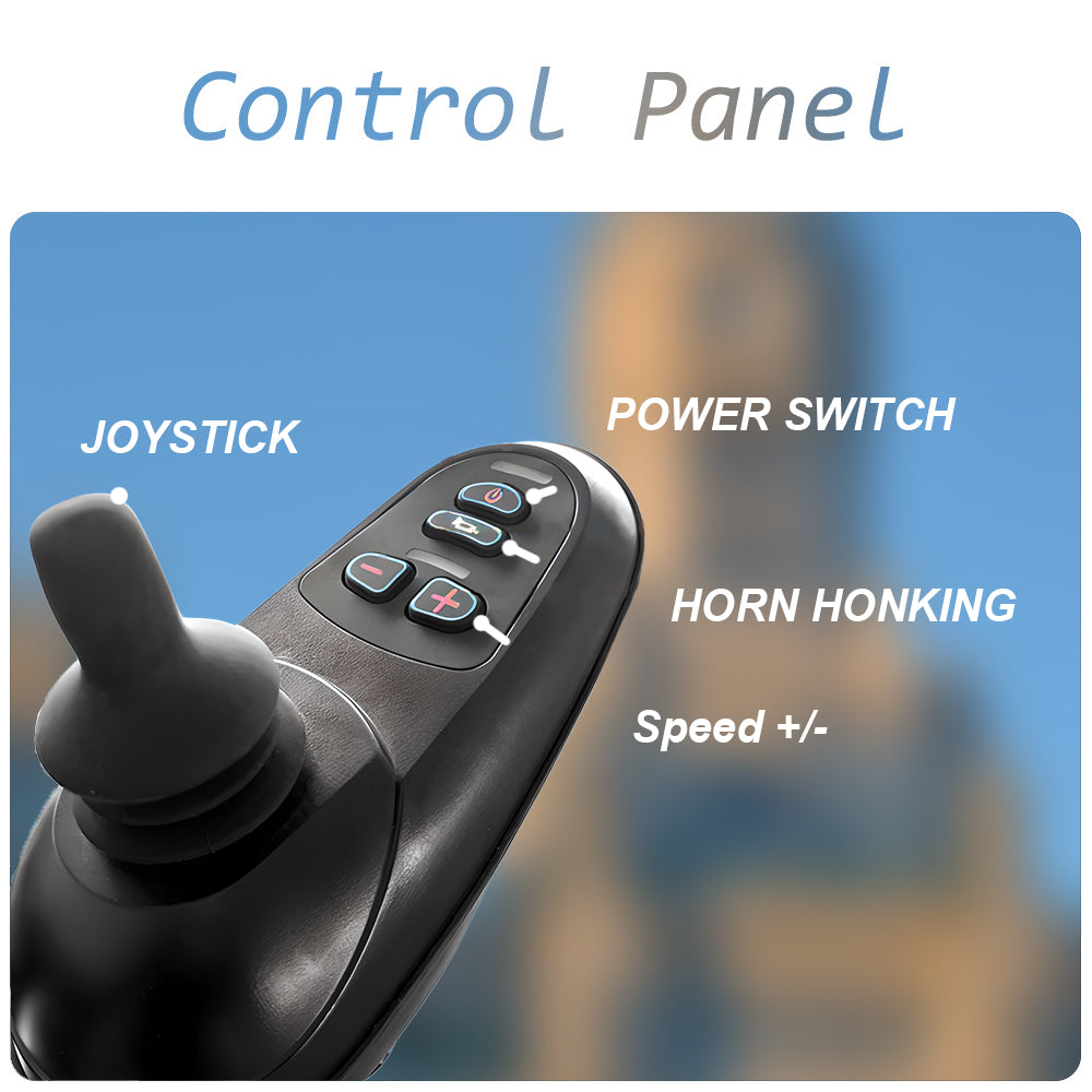 Left/right-hand reversible joystick with 5-speed adjustment, power switch, and horn -