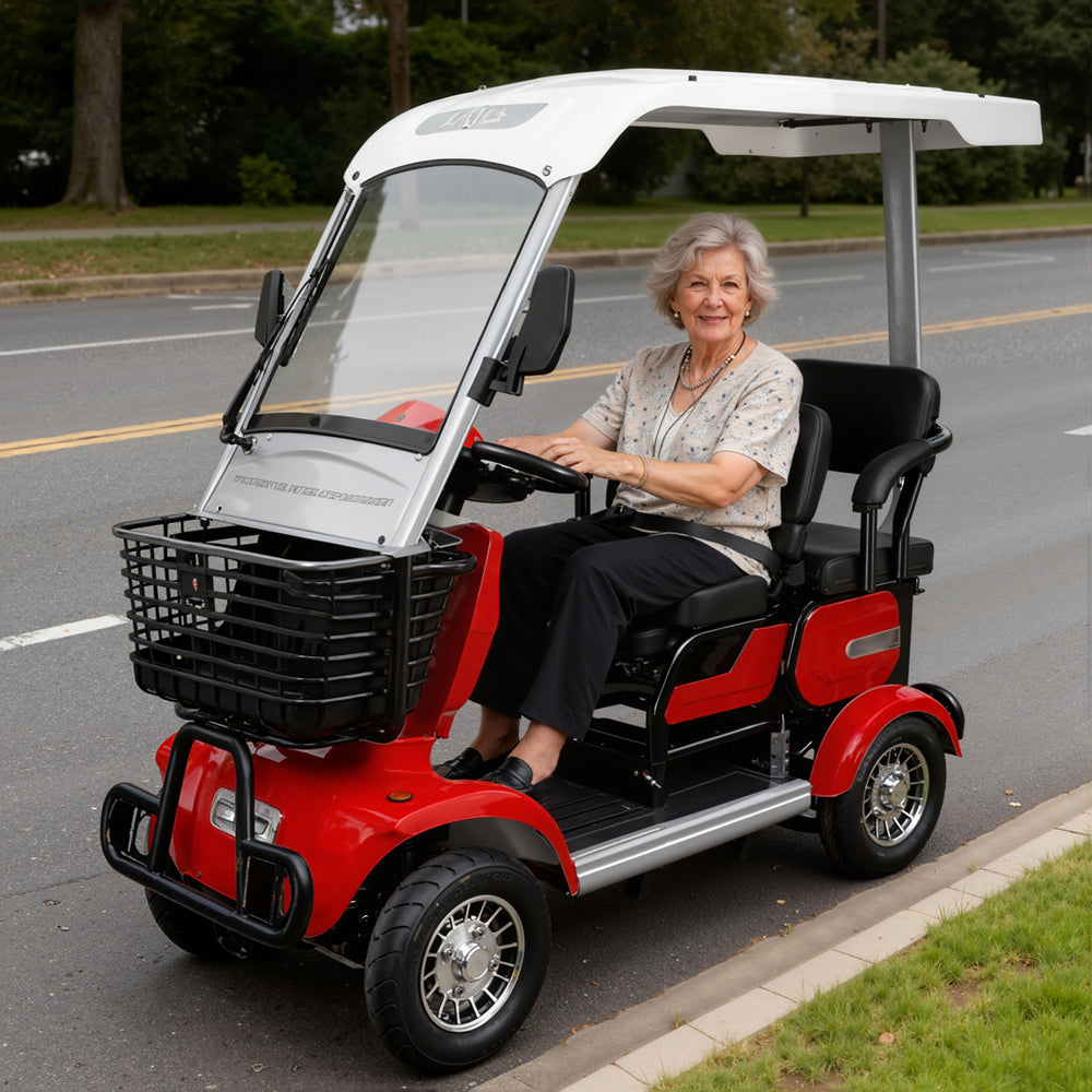 Designed for comfortable family outings, this electric mobility cart features an innovative child seat, spacious seating for two adults, and flexible storage. With strong terrain adaptability and high load-bearing capacity, it ensures a safe, convenient, and inclusive ride for urban and suburban use.